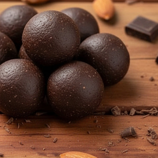 • Almond butter, dates, 70% Chocolate (Cocoa Mass, Sugar, Cocoa Butter, SOYA Lecitin, Vanilla Extract).