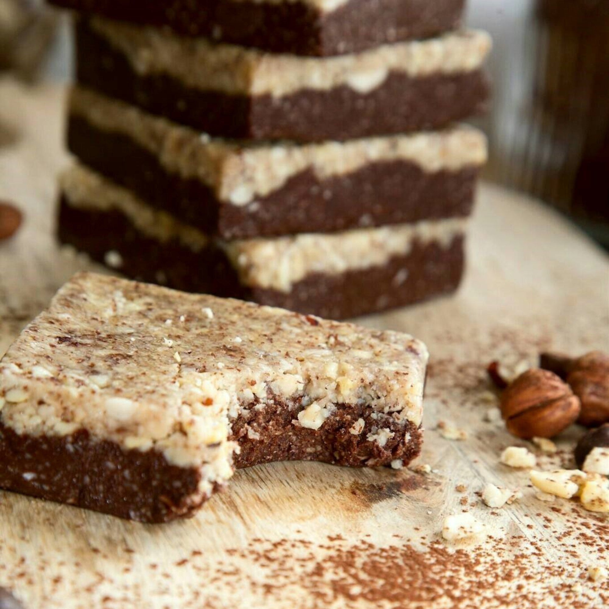 A 'Choc Fudgy' Bottom Layer of Nuts and Almond Butter Topped with Crunchy Hazelnuts, Cashews and Organic Coconut Oil